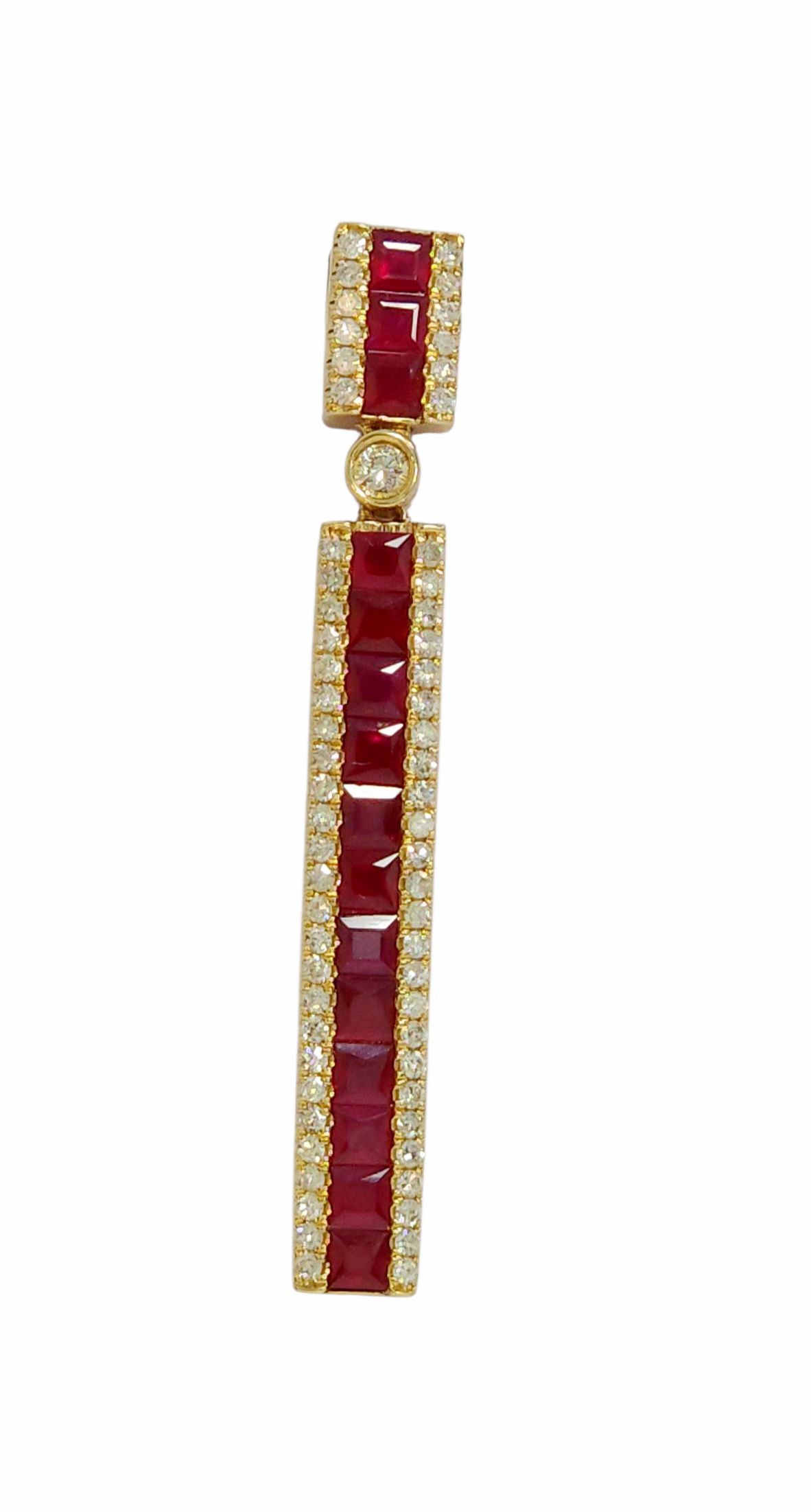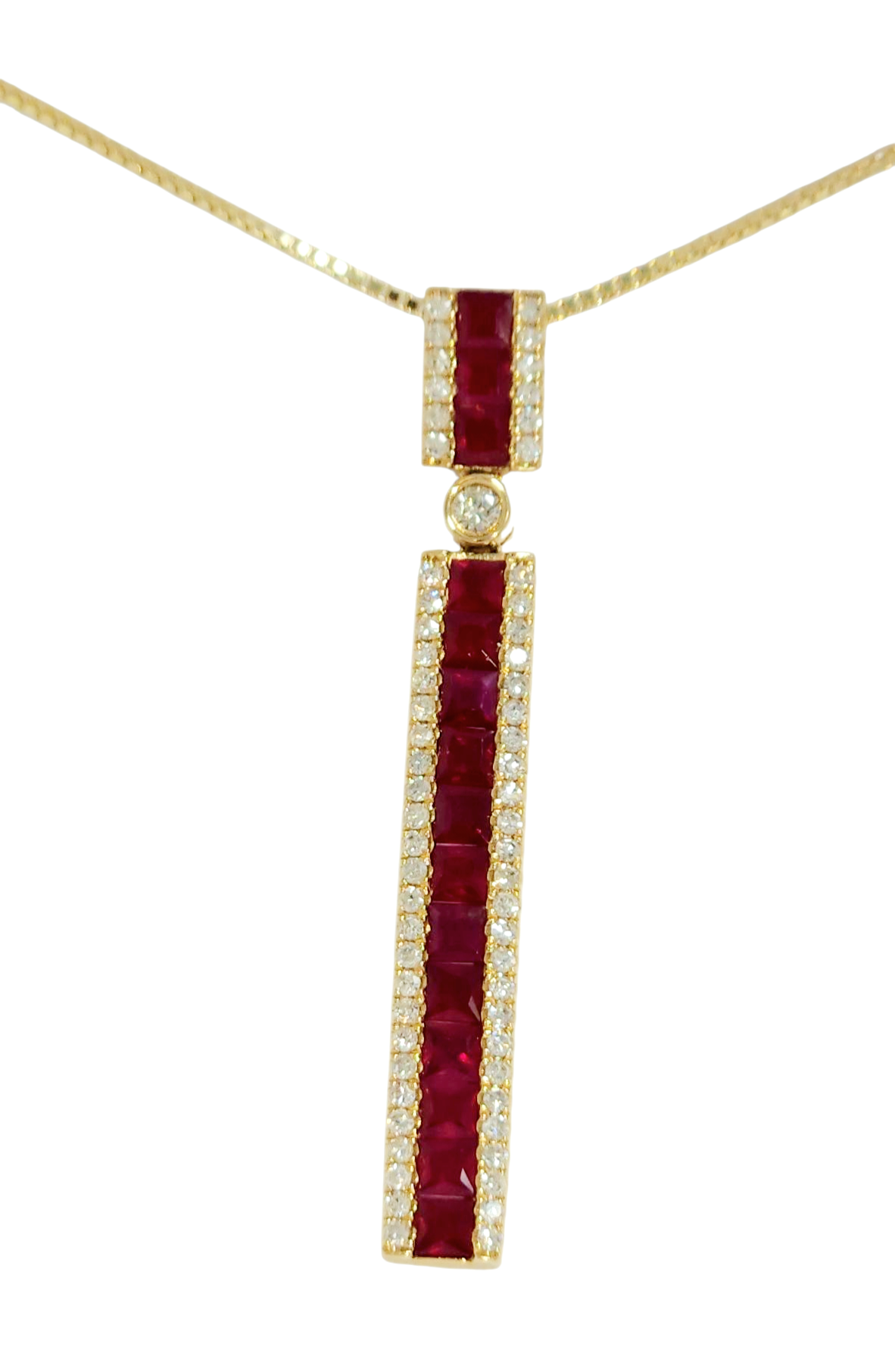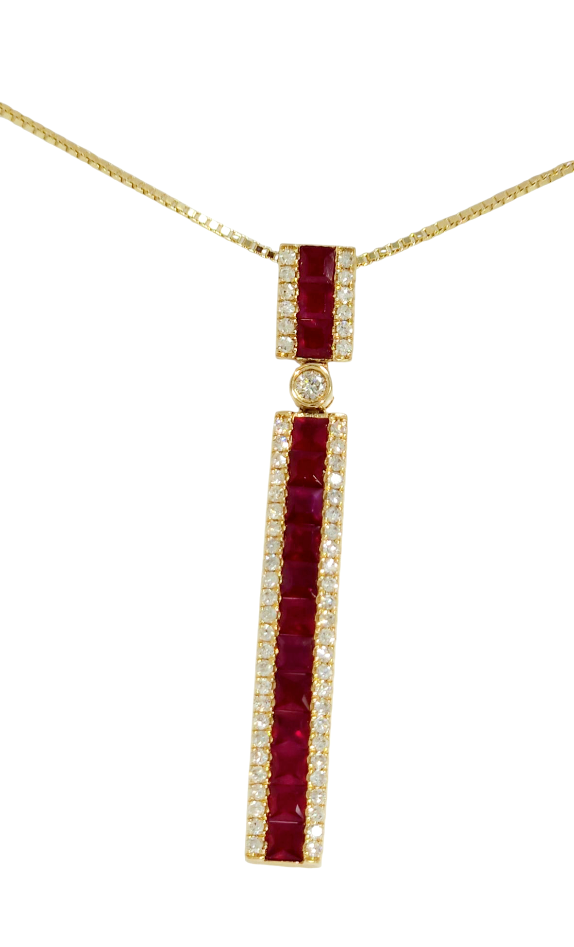 Say hello to your new forever treasure. This ruby and diamond pendant is a regal composition of bold geometry and soft brilliance—made to catch eyes and never let go. - 15 princess-cut rubies — A fiery lineup totaling 1.47 CT, radiant with rich, round diamond accents totaling .36 CT side sparkle for contrast and charm
