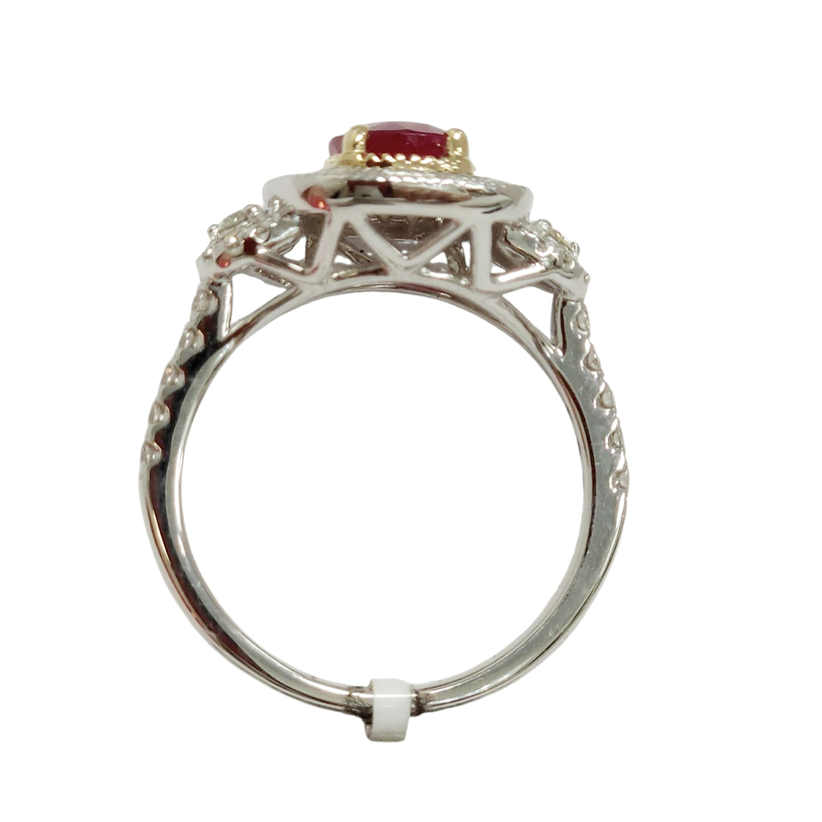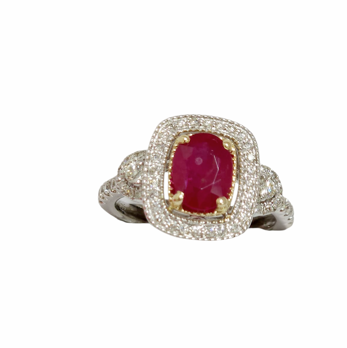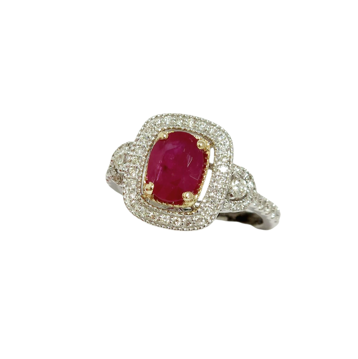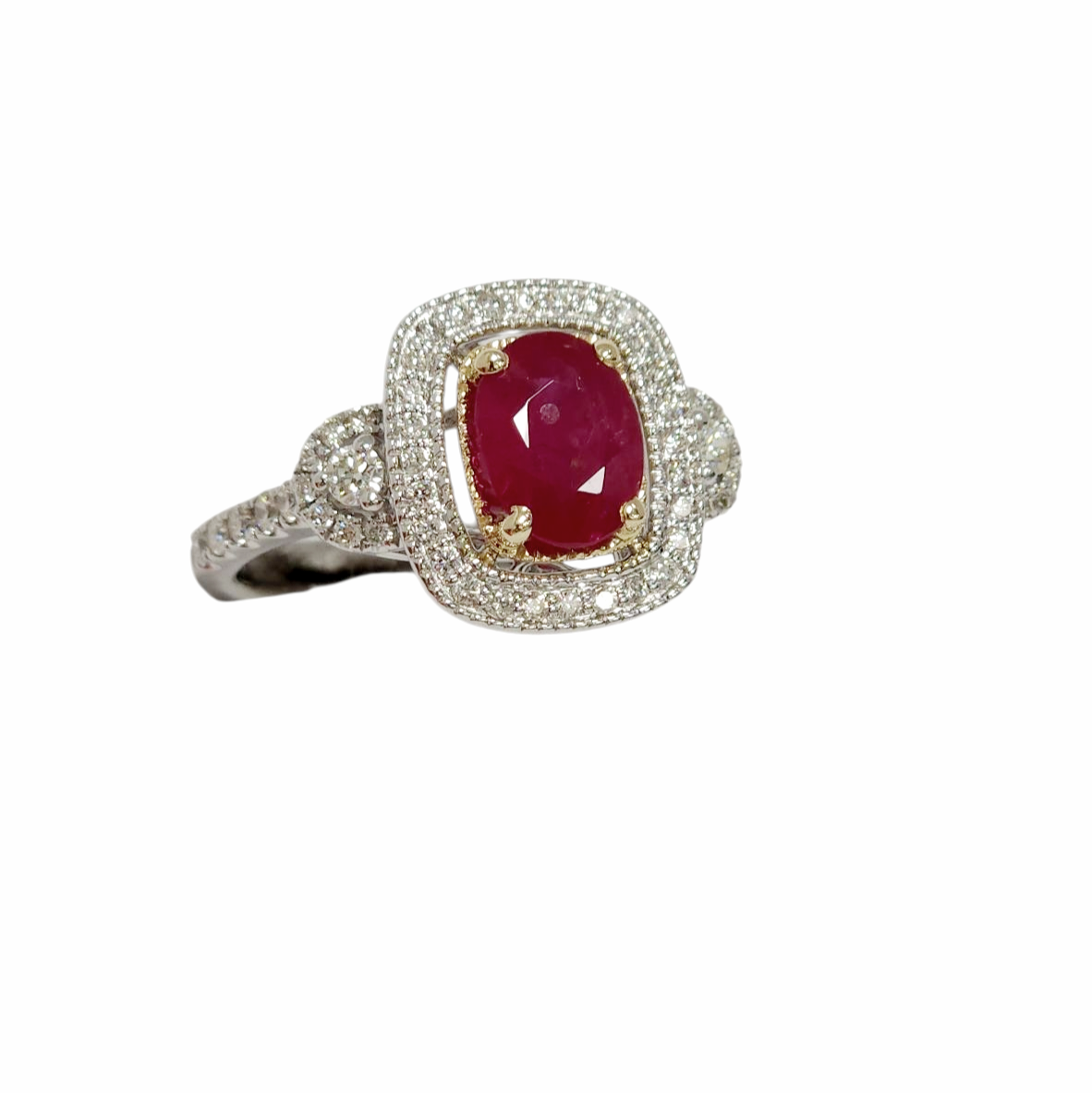 This exquisite 14K two-tone ring features a stunning 1.71-carat emerald-cut ruby, beautifully complemented by a 0.42-carat round diamond halo. Weighing 4.57 grams and sized at 7, it offers a perfect balance of elegance and sophistication, making it a timeless addition to any jewelry collection.