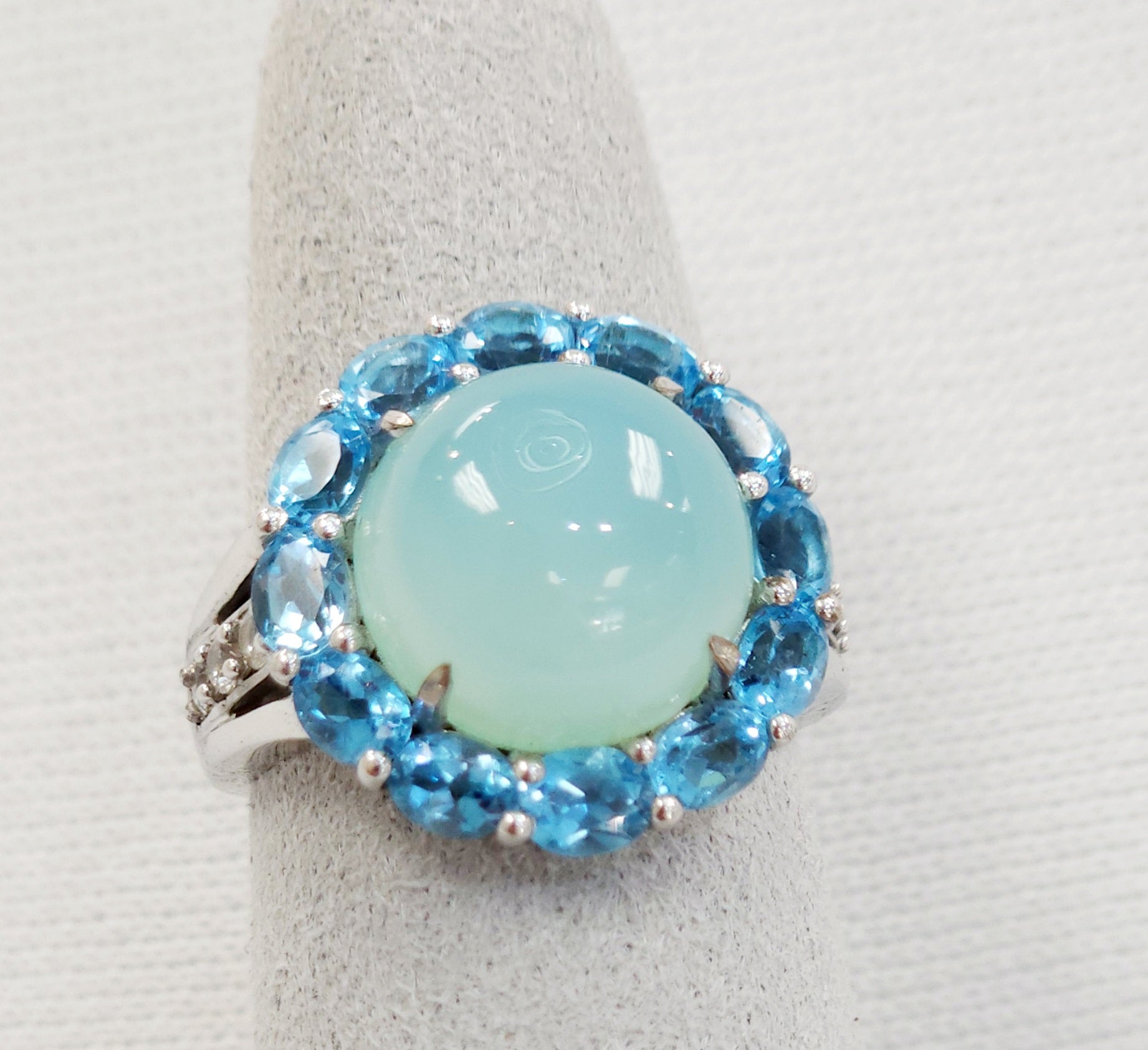 Chalcedony Cabochon, Topaz & white Zircon Ring