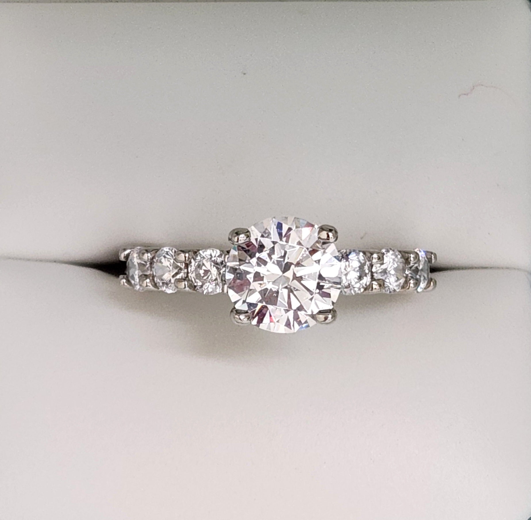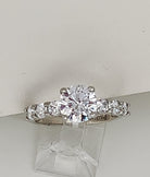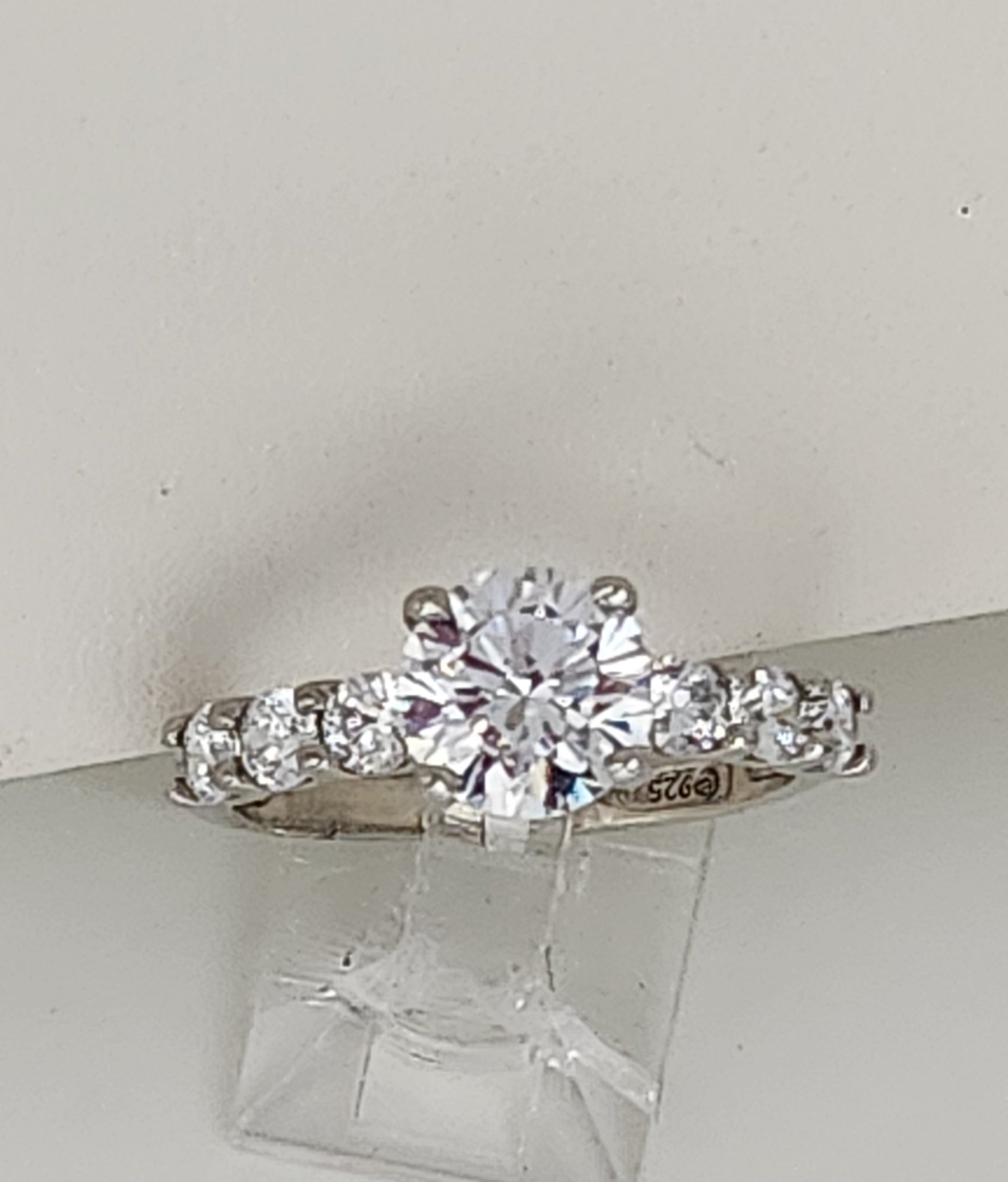 8mm Cubic Zirconia center stone and 6 round Cubic Zirconia at 3mm each on sides, set in Sterling Silver, 3.6g