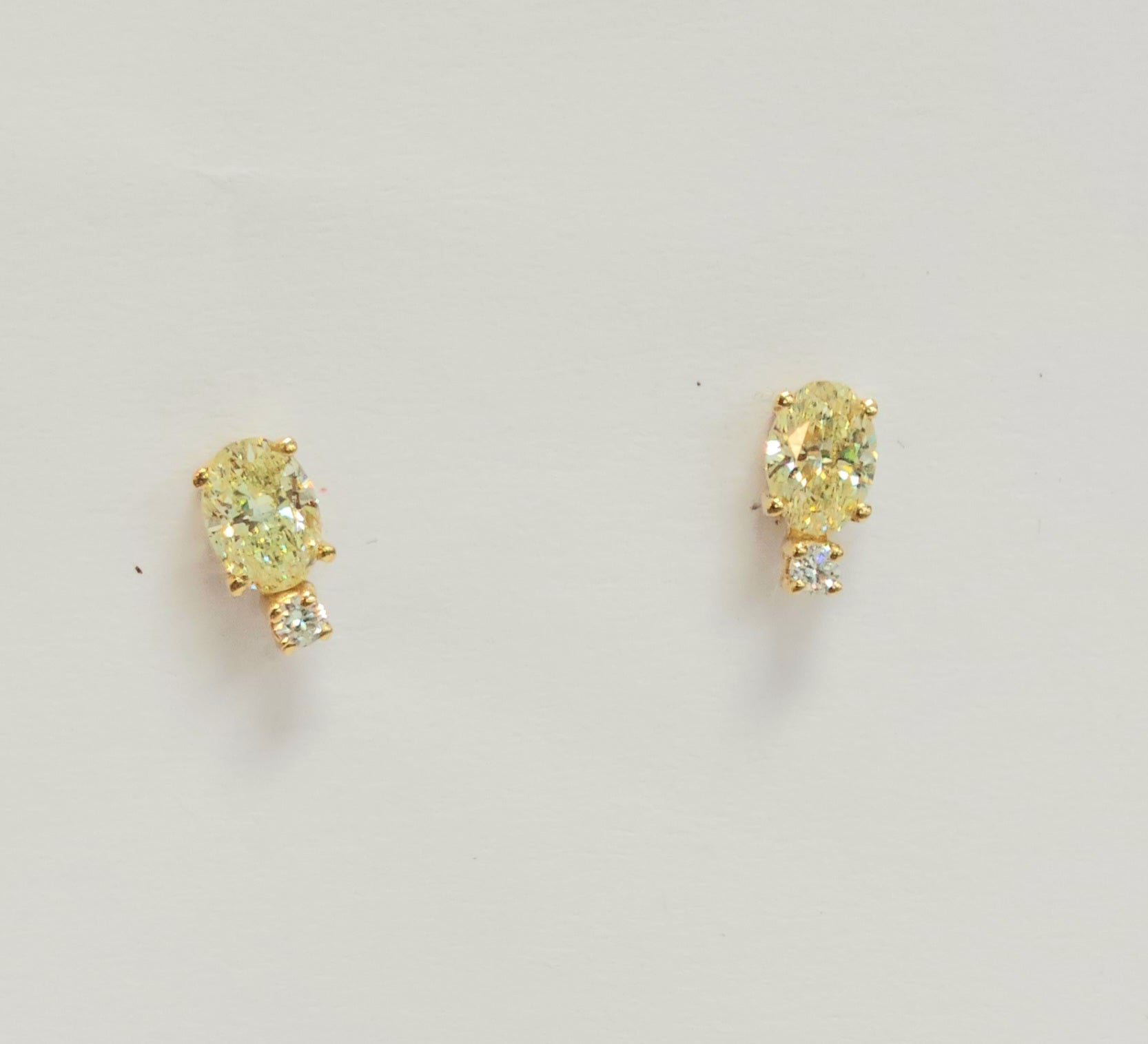 These elegant Yellow Diamond Post Earrings feature 14KY gold settings showcasing stunning oval premium fancy canary diamonds, totaling .60CT and complemented by delicate round diamonds totaling .08CT. Their refined design highlights the vibrant color and brilliance of the stones, perfect for adding a touch of sophistication to any ensemble.